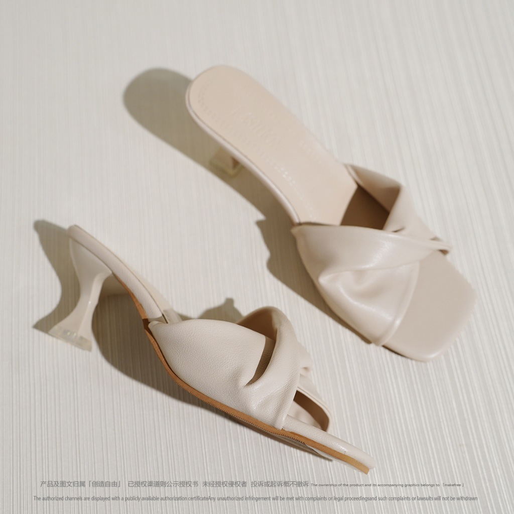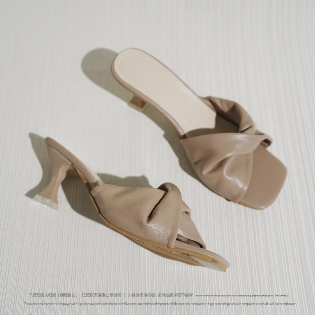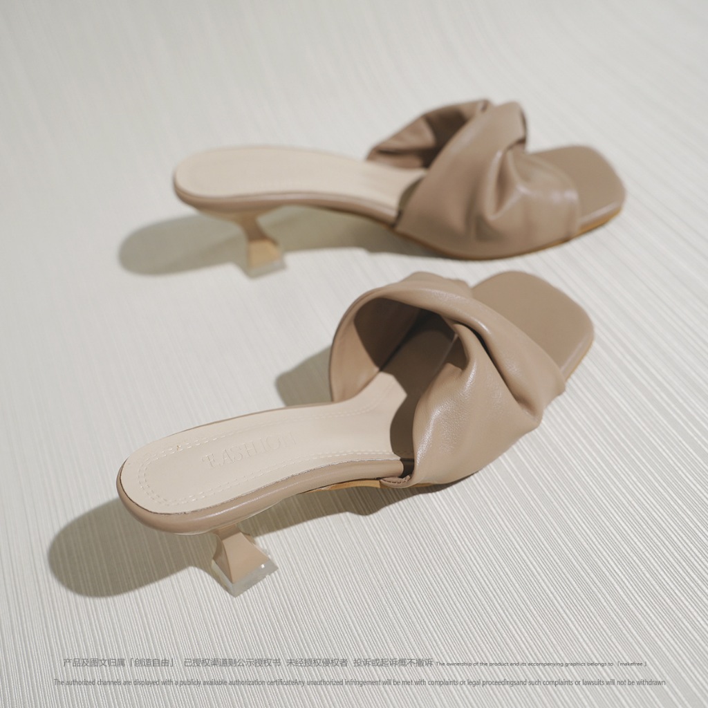 Sandal Heels Wanita Hak 3 cm Sandal Pakaian Luar Prancis Sederhana Sandal Moccasin Kaki Persegi