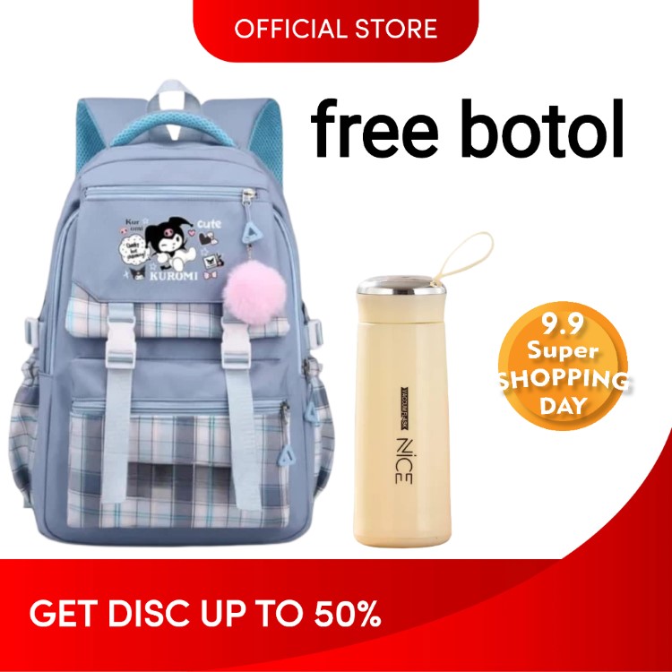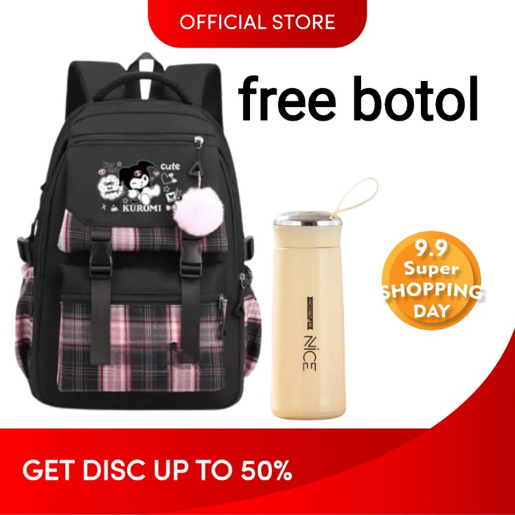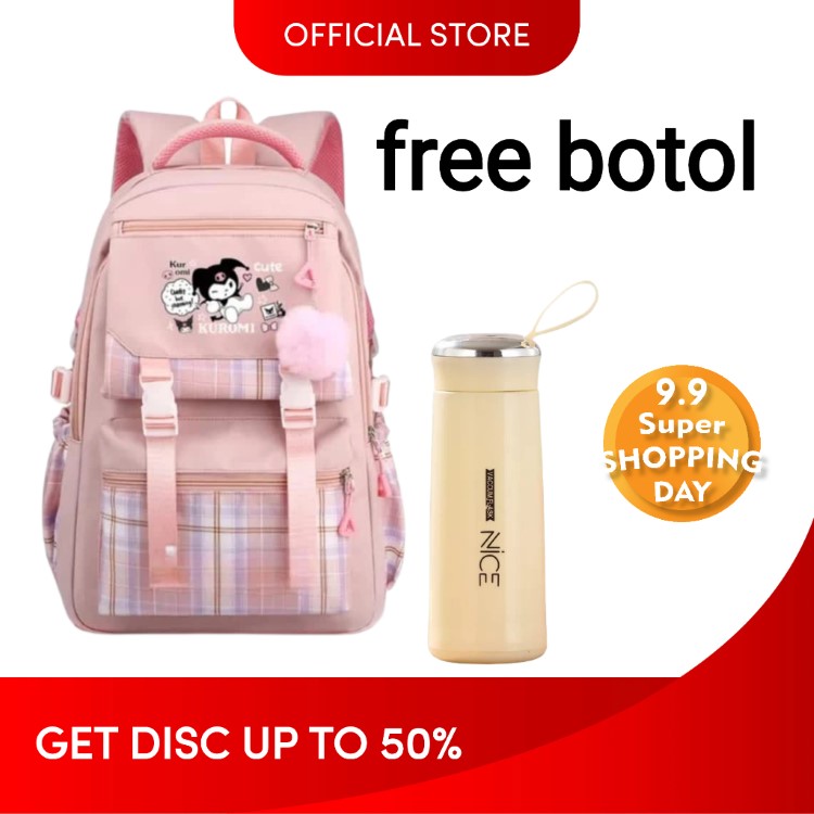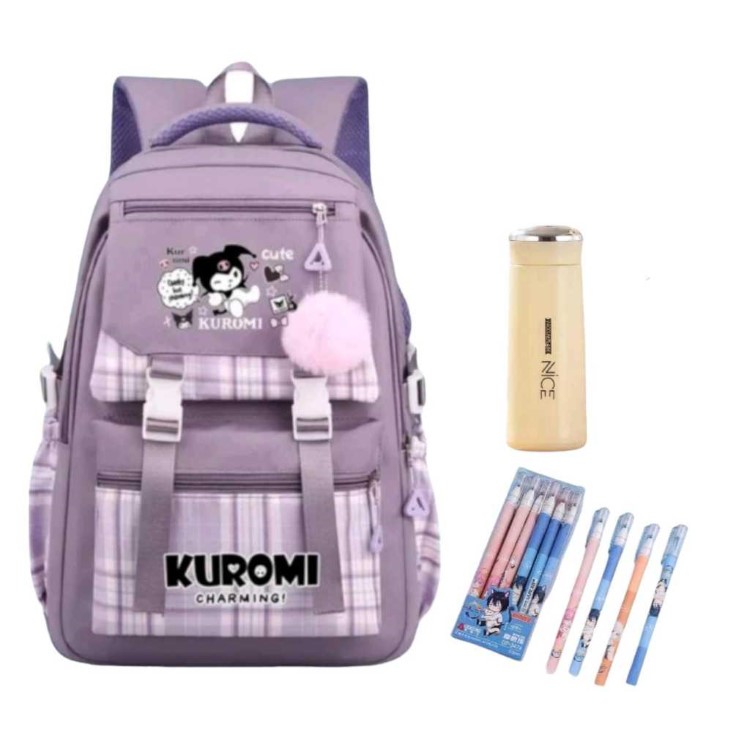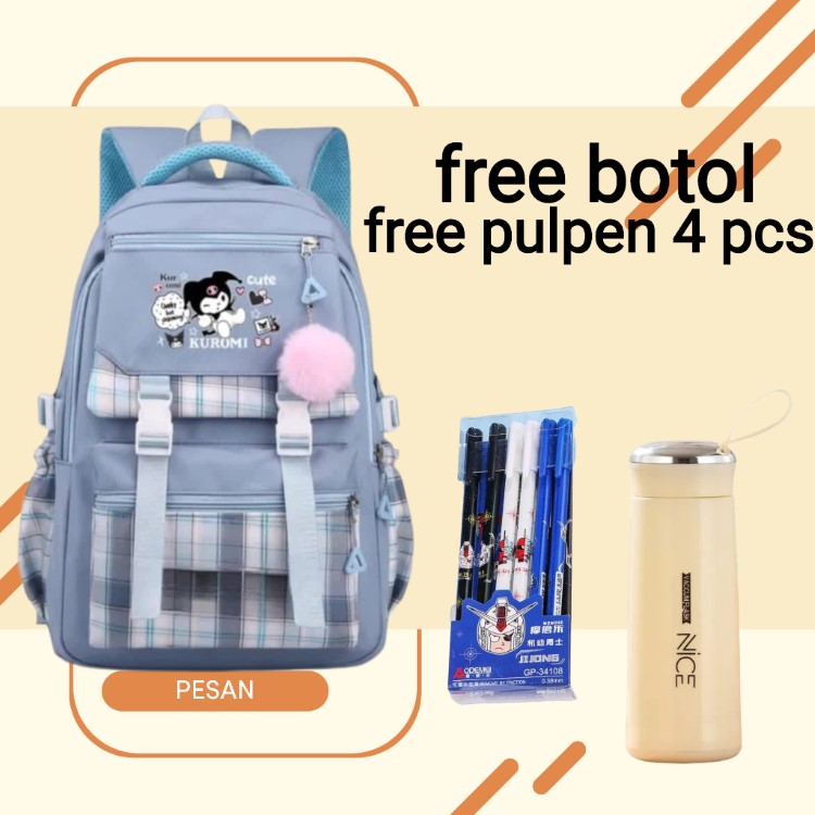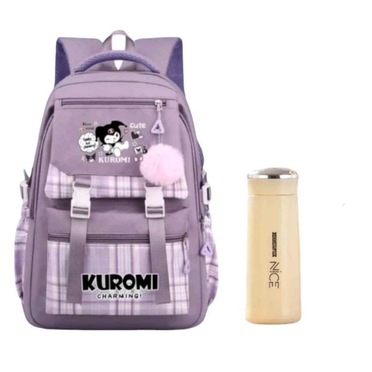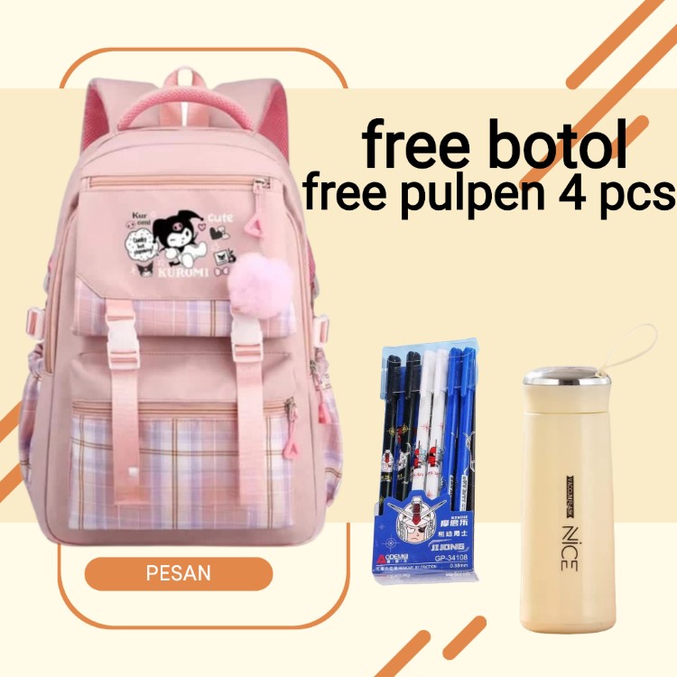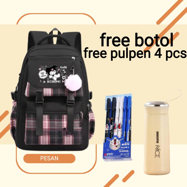 Tas Ransel Sekolah Anak Perempuan SD Terbaru Kuromi Cute Motif Polkadot dan Garis Garis Free Botol + Pulpen Berkualitas