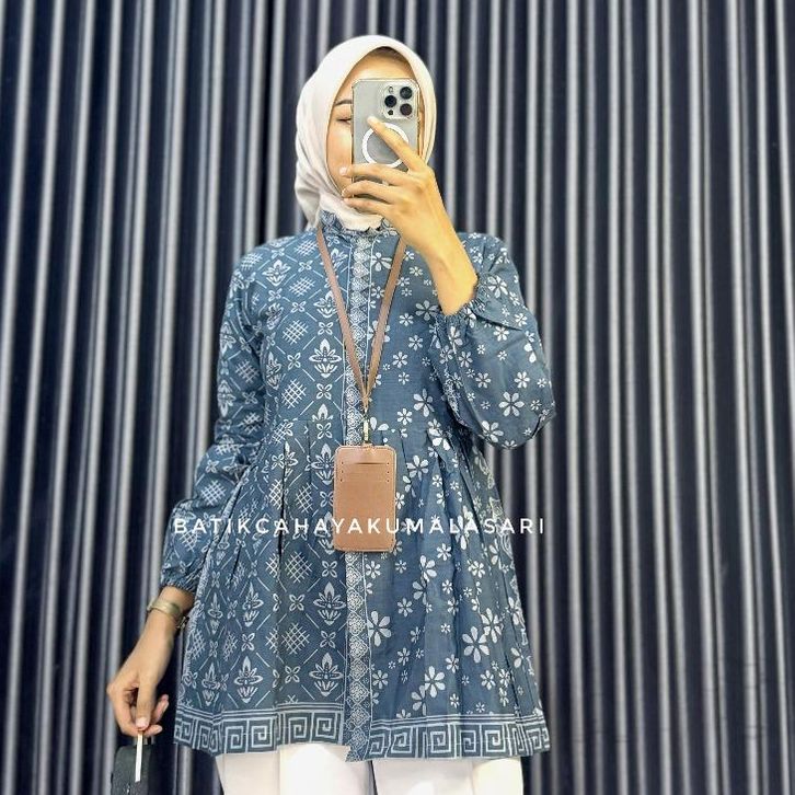 PROMO Blouse Batik Wanita Lengan Balon Motif ROMECCA BIRU DENIM - Atasan Kerja Wanita Bahan Katun Prima