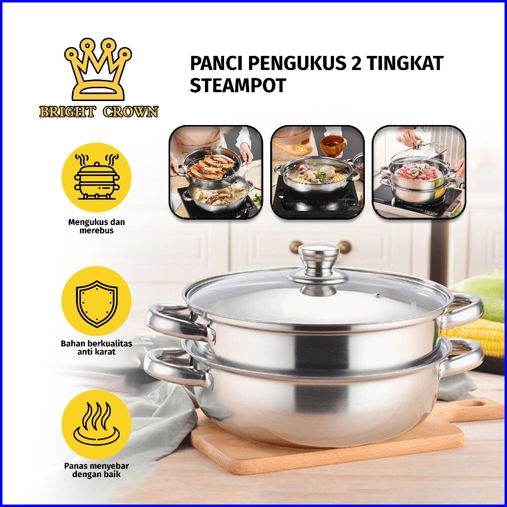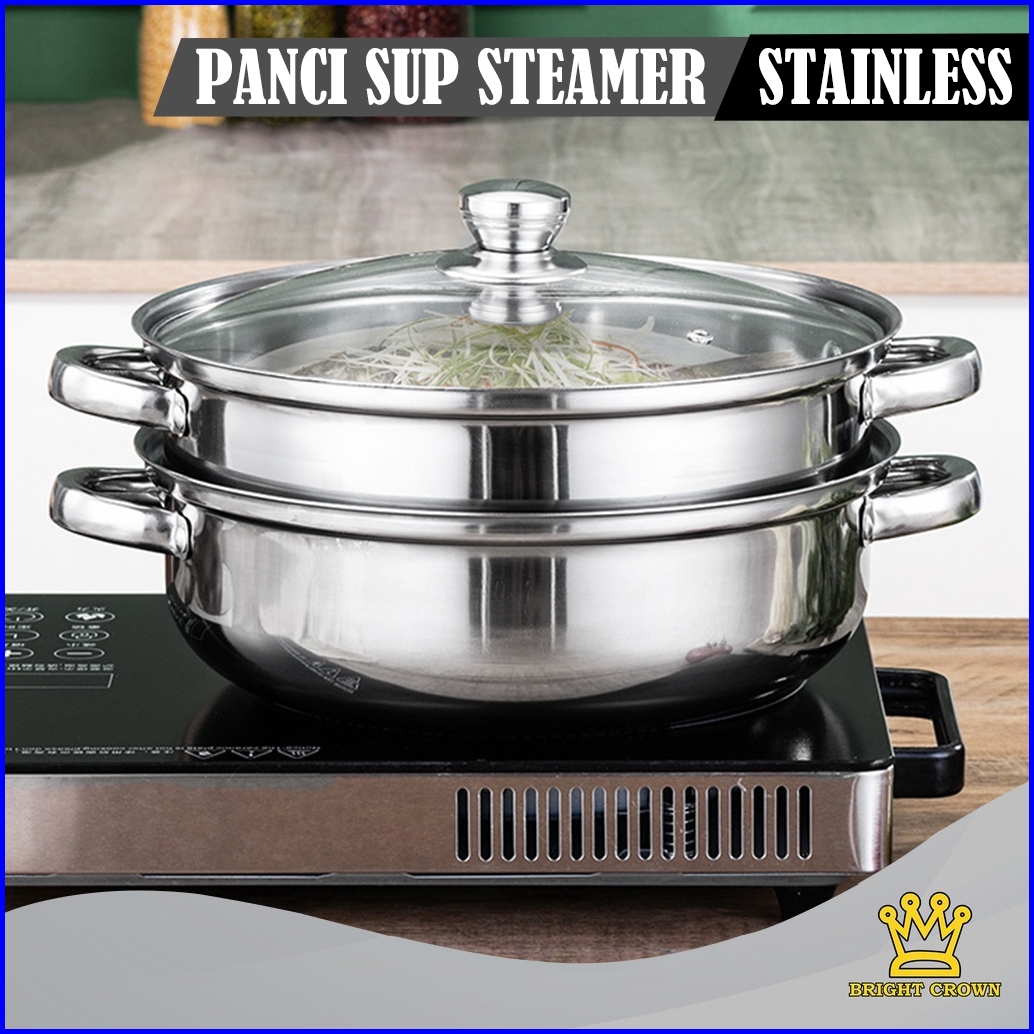Yatt By Bright Crown Panci Sup Steamer 3in1 Uk 28 Cm Stainless Steel Tutup Kaca Tier Steamer Pan