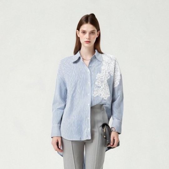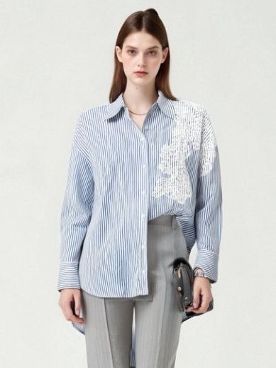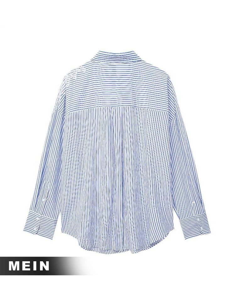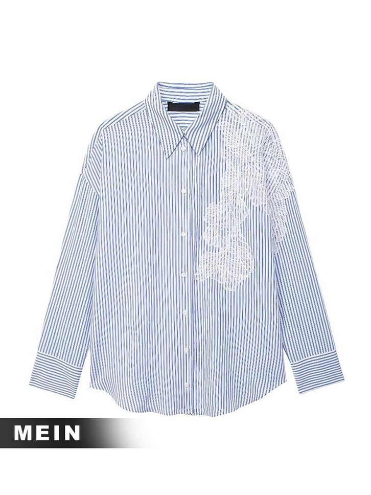 (TERMURAH)MEIN] Kemeja Bergaris Hiasan Bunga Bordir Kasual Wanita 6739