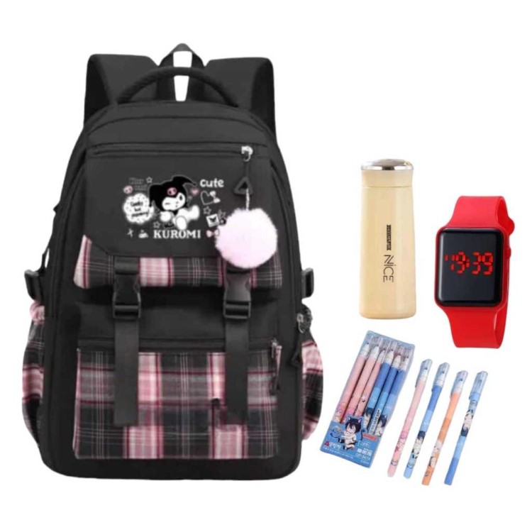 Tas Ransel Sekolah Anak Perempuan SD Terbaru Kuromi Cute Motif Polkadot Kanvas Free Botol + Pulpen + Jam Berkualitas