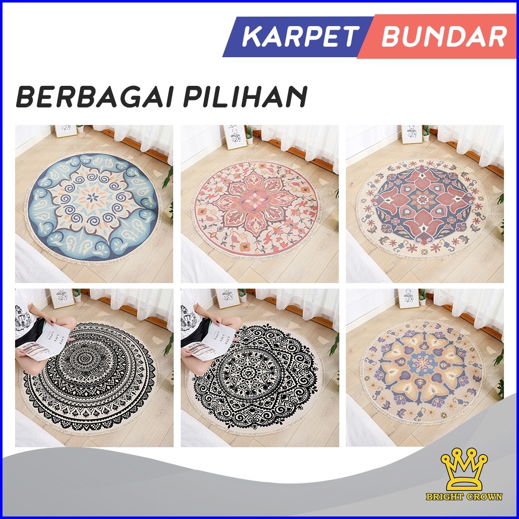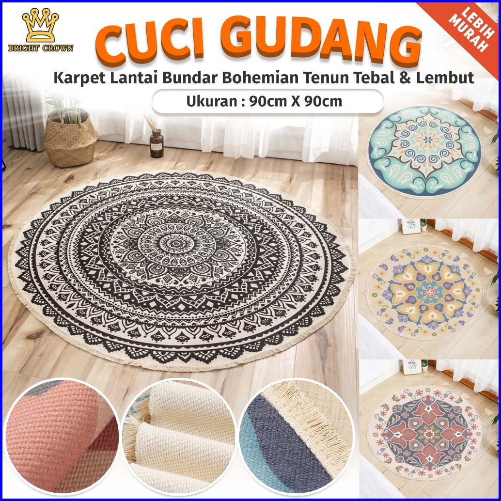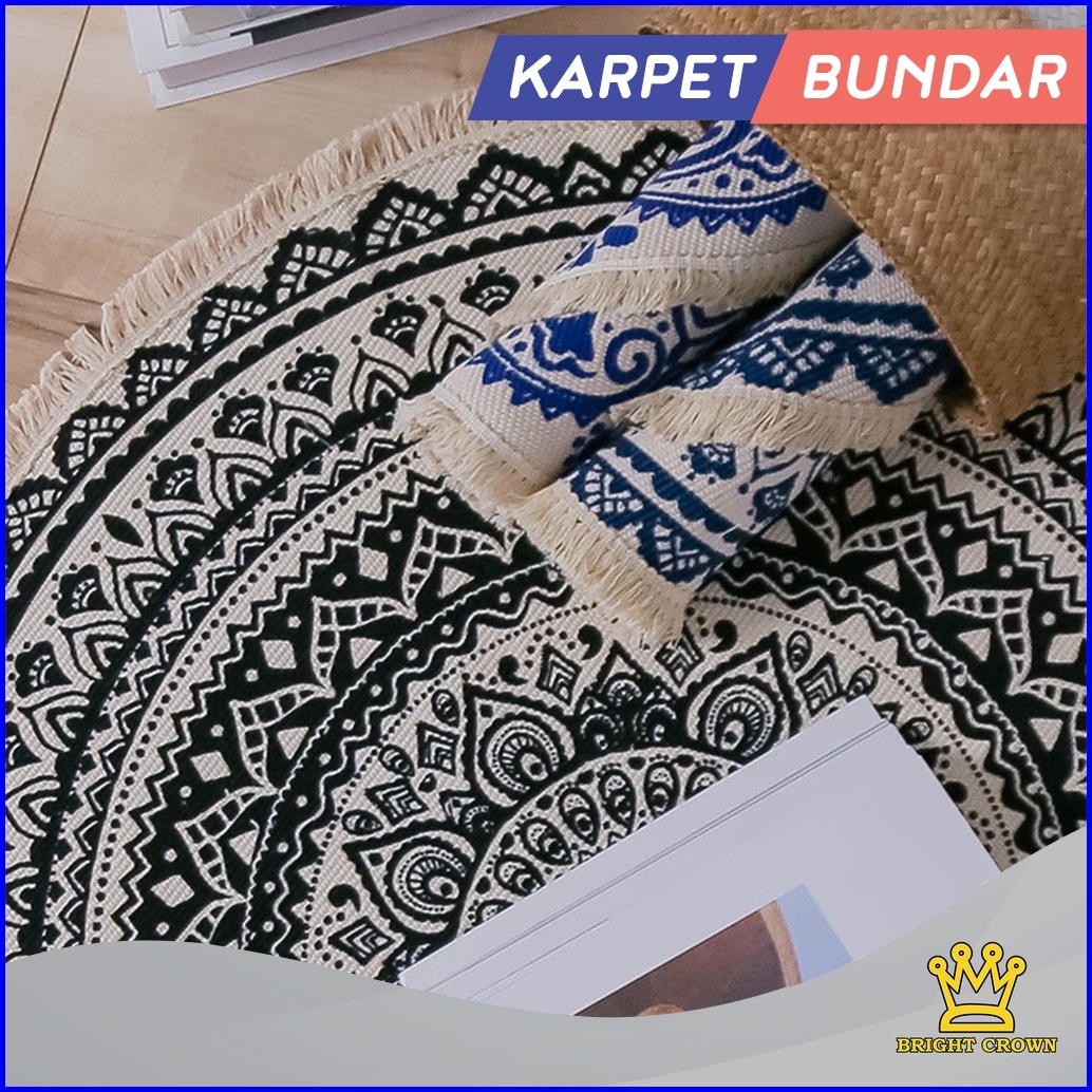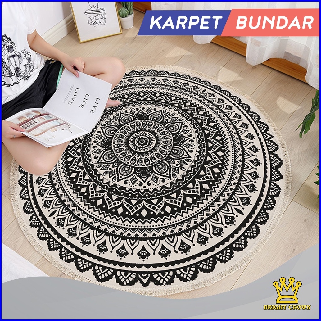 Bright Crown Promo Beli Lokal Keset Karpet Katun Tenun Linen Bohemian Bentuk Bundar Monokrom 90x90cm