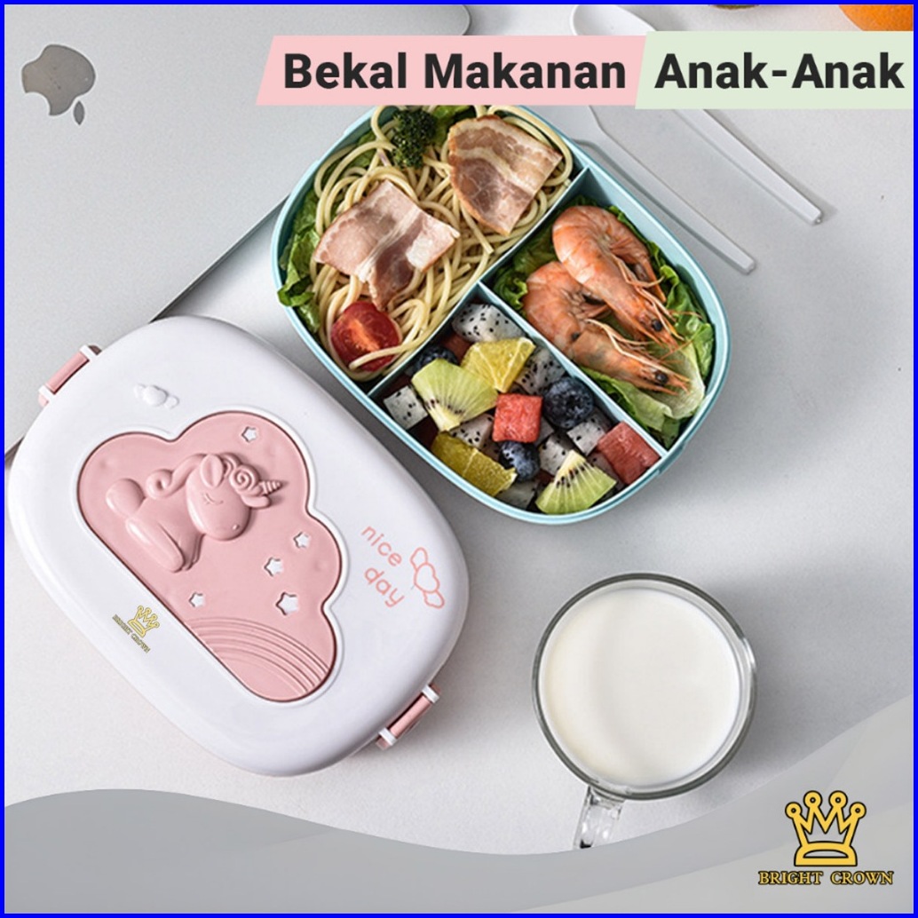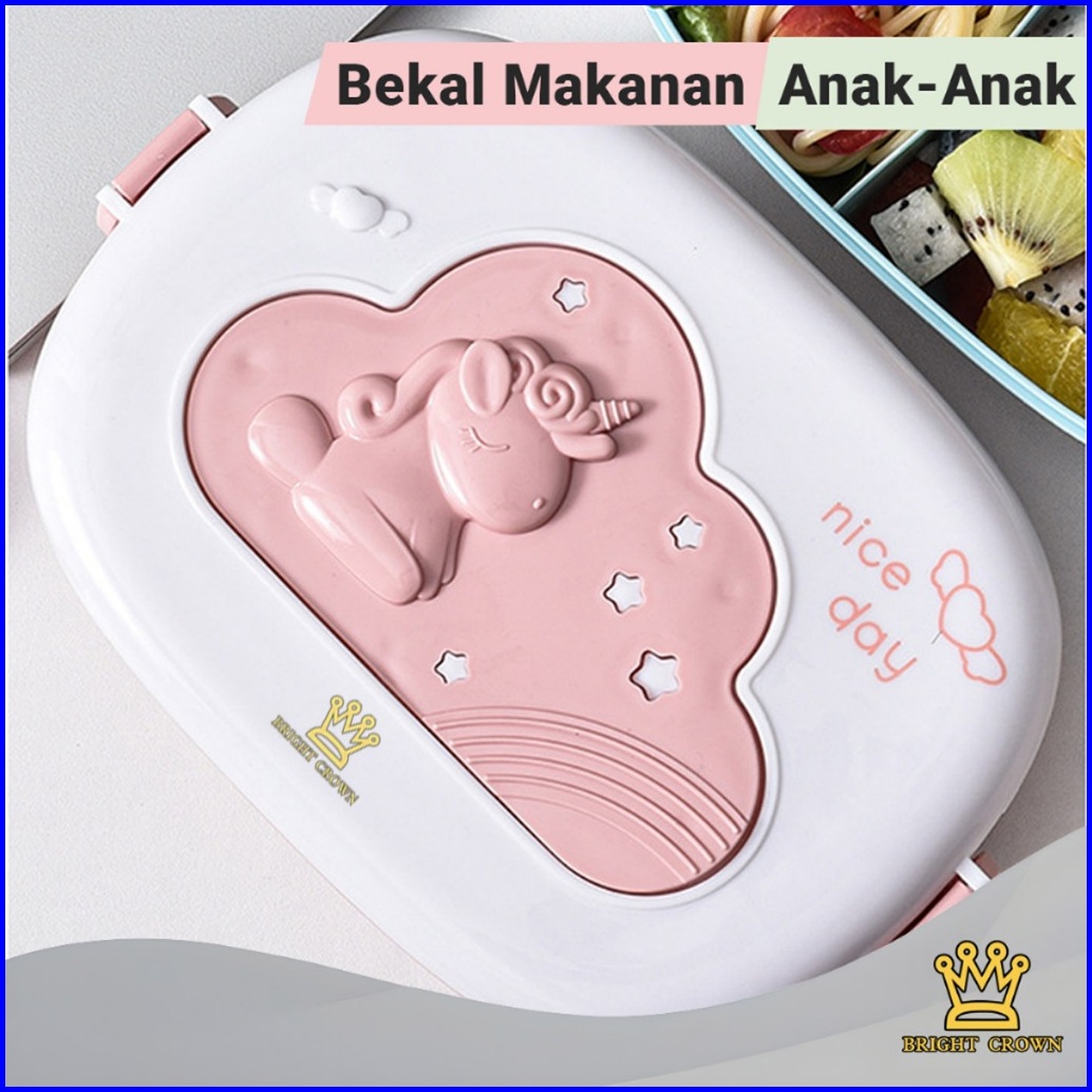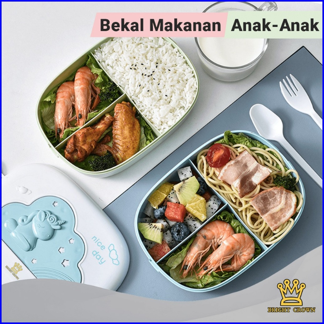 Brightcrown Set Tempat Bekal Makan Anak Bentuk Oval Karakter Unicorn Lucu 3 Sekat Sendok Garpu 800ml
