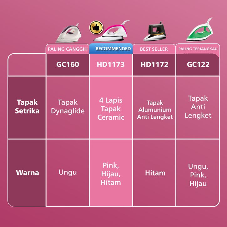 Philips Setrika kering HD1173/40 Pink, Ceramic 4 Lapis, Anti-Lengket, seterika philips, gosokan baju