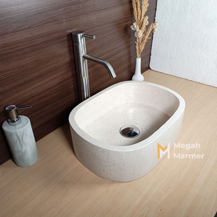 Megah Marmer | Wastafel Terazzo Bentuk Oval Ukuran 40cm Estetik Minimalis Glossy Free Packing Kayu