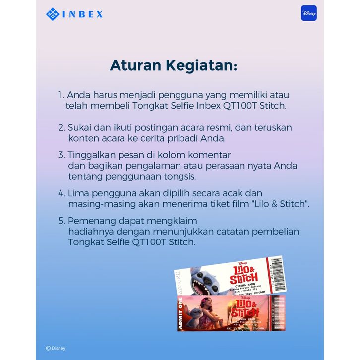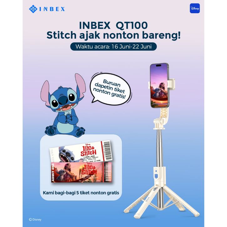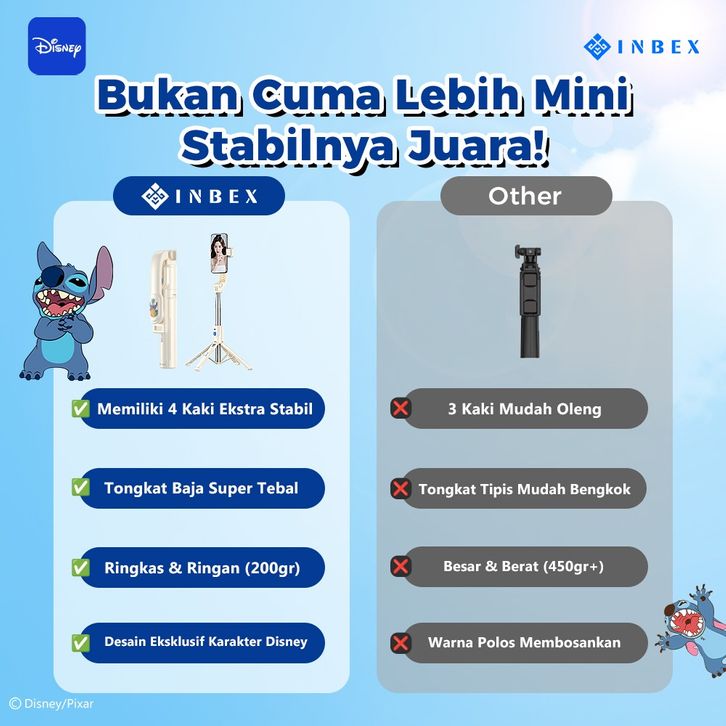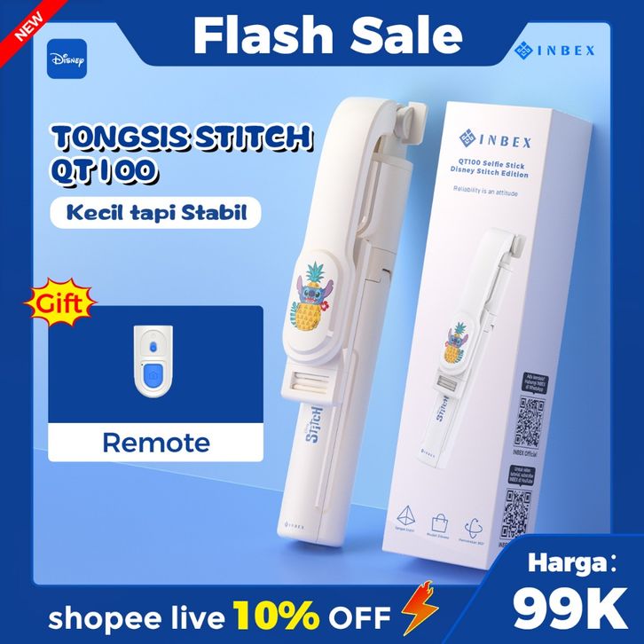 INBEX QT100 Disney Stitch Tongsis Tri Handphone Remote Bluetooth Tongsis Travel dan Konten Kreator