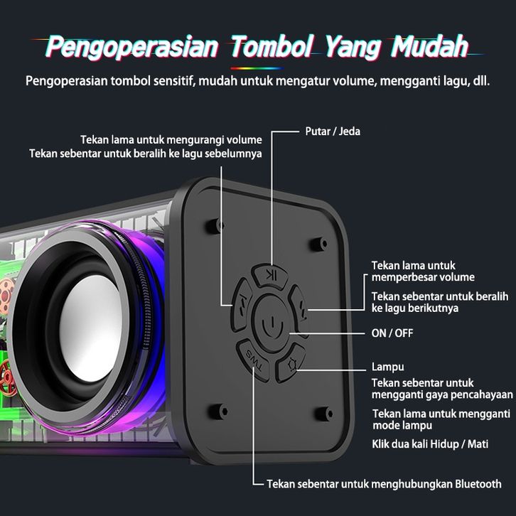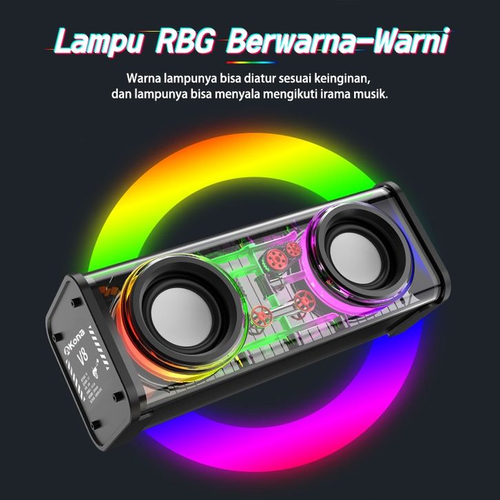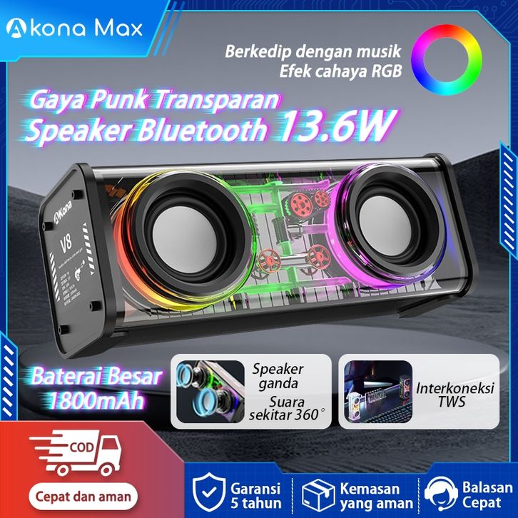 Akona Speaker Bluetooth Cyberpunk 13.6W Daya Tinggi Speaker Bass Bluetooth RGB LED Light Akrilik Transparan V8 Spiker B