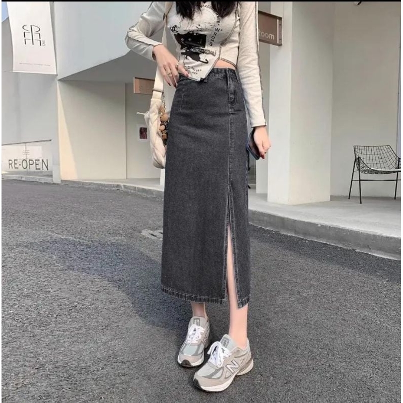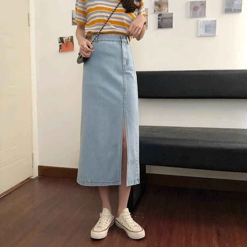 Rok jeans higwaist belah samping korean style rok A-line