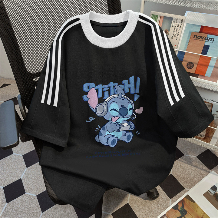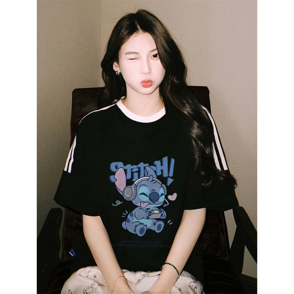 Adkwy Baju Wanita Putih Black Kaos Premium Lengan Pendek Oversize Cetakan Stitch Biru Atasan Wanita Kekinian Korean Styl