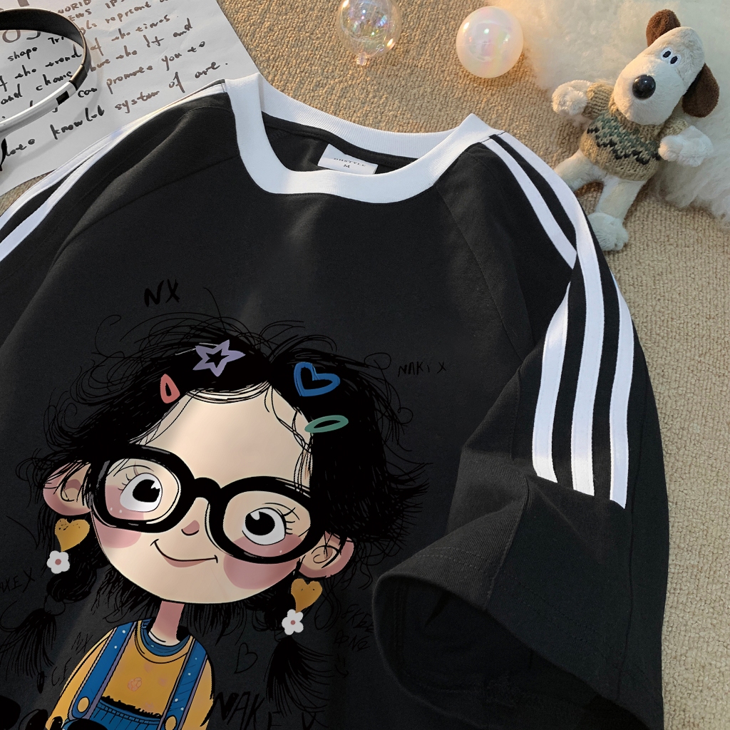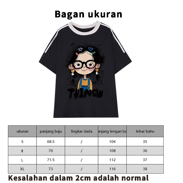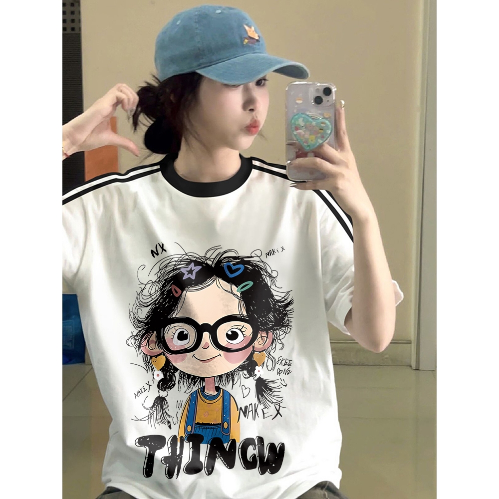Forteid cetakan merek trendi retro Baju Oversize Cetakan gadis kartun lucu yang berantakan Korean Style Kaos Longgar