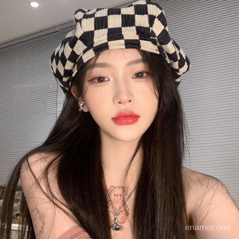 Topi kotak-kotak wanita baret topi pelukis segi delapan kotak-kotak hitam dan putih wanita