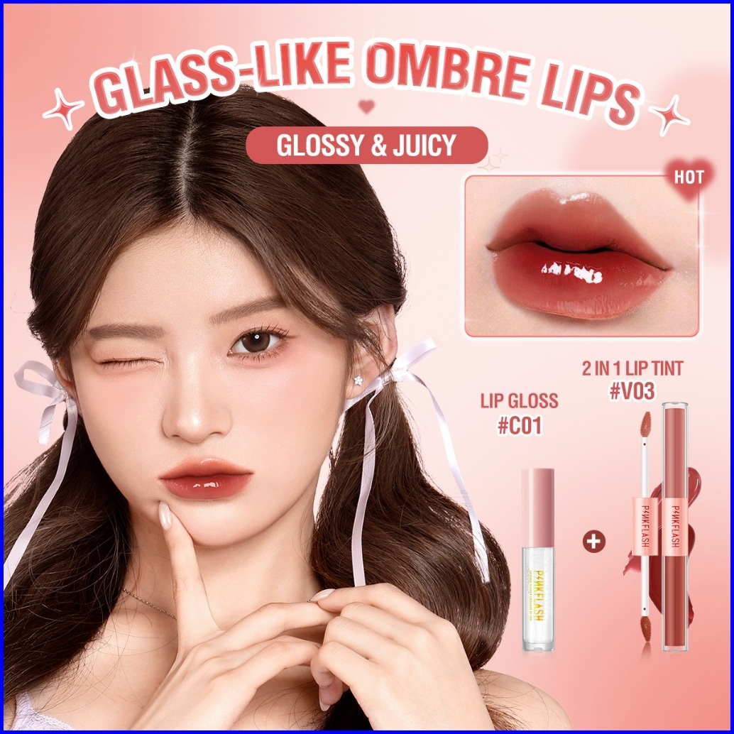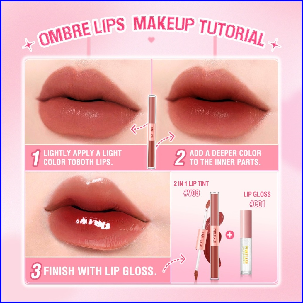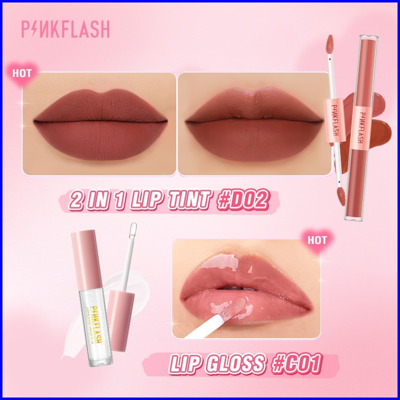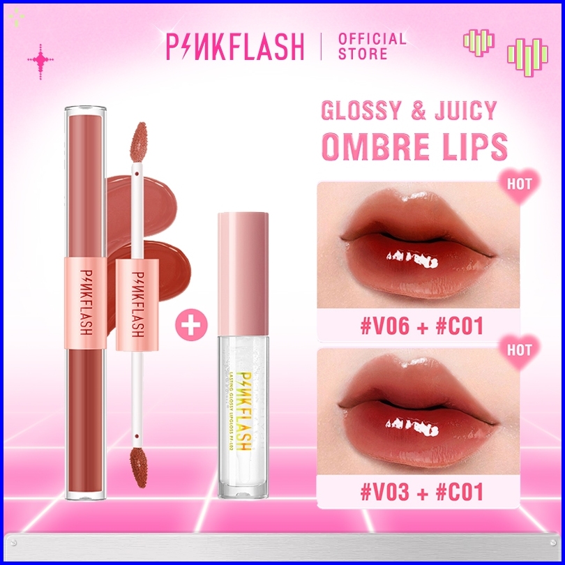 Pinkflash 2pcs Set Glossy Juicy Lips Set 2 In 1 Matte Velvet Liquid Lipstick Lip Tint Lip Gloss Ombrelips