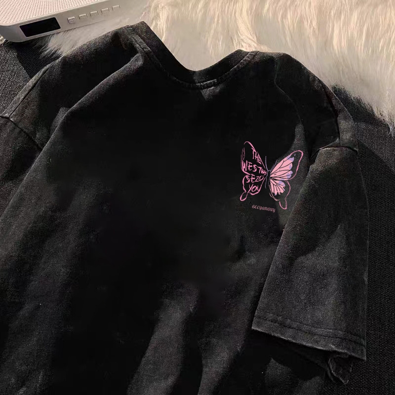 Po floret Washed Kaos Oversize Lengan Pendek T-Shirt Purple Butterfly Katun Murni Retro Style Wanita Top