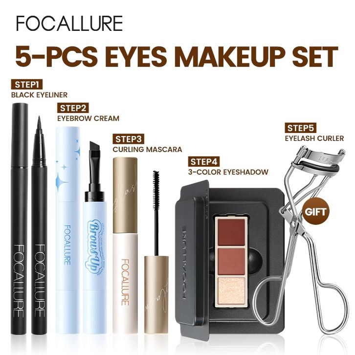 MAKE UP SET FOCALLURE 5PCS EYES MAKEUP SET EYELINER EYEBROW MASCARA EYESHADOW EYELASH CURLER
