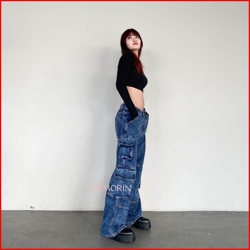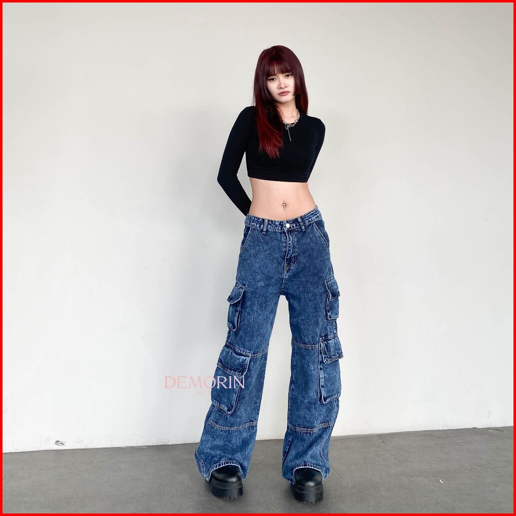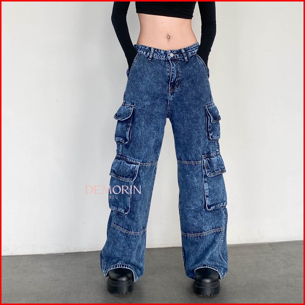 Demorin Ep1 Hanna Celana Panjang Jeans Wanita High Waist Cargo Acid Wash Jeans Boyfriend Fashionable Dan Kekinian