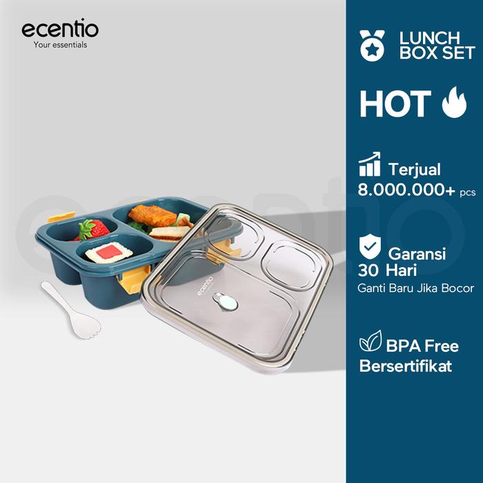 TANPA DP ECENTIO 850ML KOTAK MAKAN 3 GRID DENGAN KOTAK SUP BAWALAH SENDOK BIRU 850ML