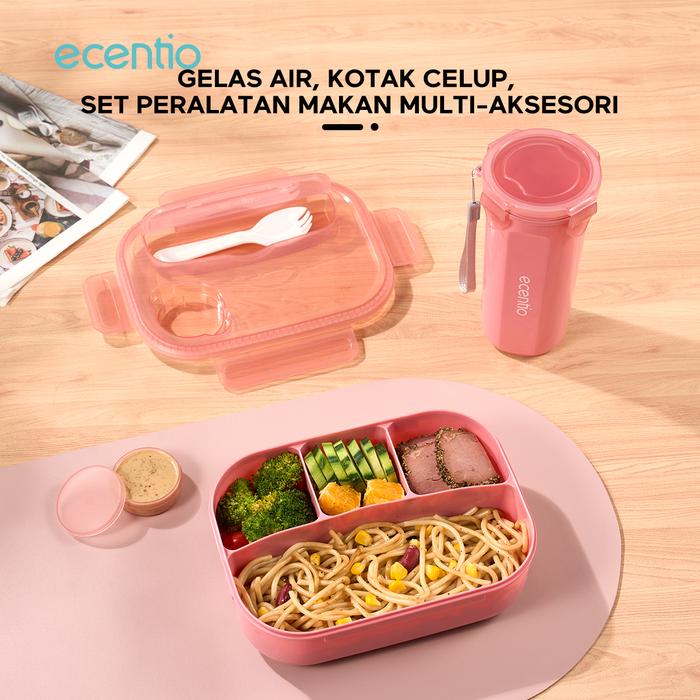 TANPA DP ECENTIO ANTISPILL LUNCH BOX SPOON LUNCH BOX SAUCE BOX 1200ML+500ML BPA FREE MERAH MUDA