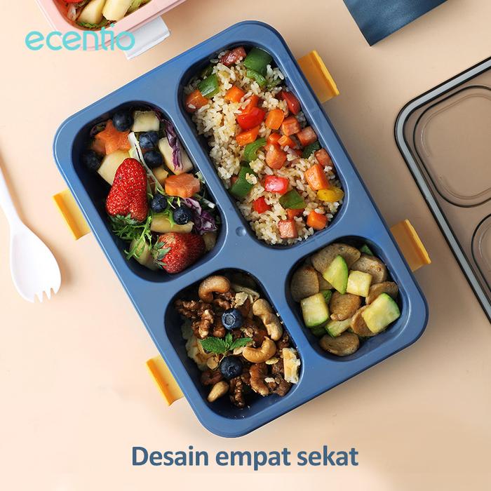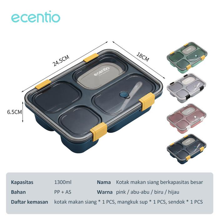 TANPA DP ECENTIO 1300ML 4GRIDS KOTAK MAKAN LUNCH BOX DENGAN KOTAK SUP BPA FREE BIRU