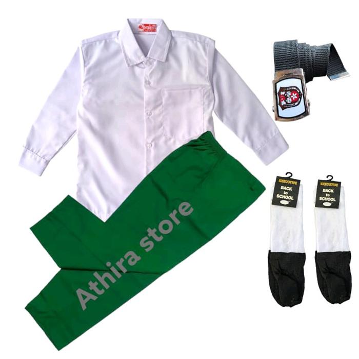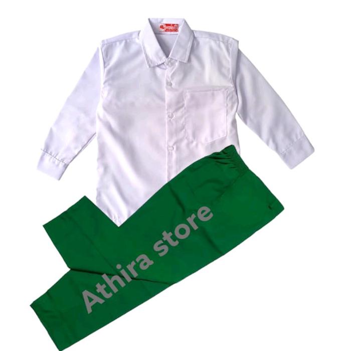 TERLARIS BAJU ANAK SD LAKI LAKI LENGAN PANJANG PUTIH POLOS DAN CELANA HIJAU FASHION 1 SET LENGKAP USIA 6 TAHUN