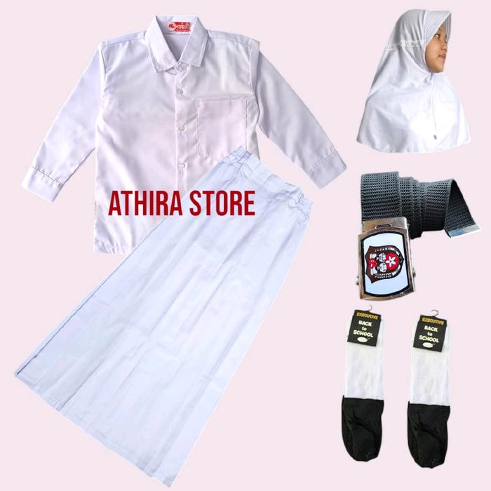 TERLARIS STELAN SERAGAM SEKOLAH ANAK SD PUTRI ROK PUTIH BAJU PUTIH LENGAN PANJANG FASHION 1 SET PAKAI JILBAB 6 THN