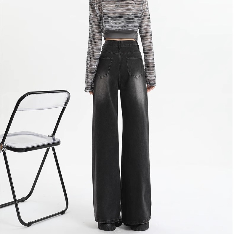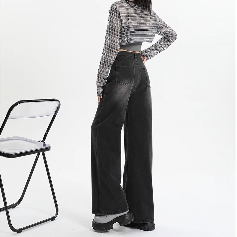 Highwaist Fashion Celana Jeans Wanita Pants Denim Kasual Loose Jins Boyfriend - Hitam abu