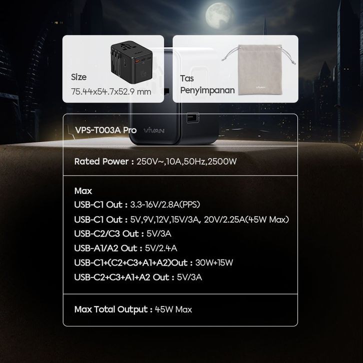 VIVAN Universal Travel Adaptor 45W GaN VPS-T003A Pro-S USB Type-C Multi-country SNI Garansi 36 Bulan
