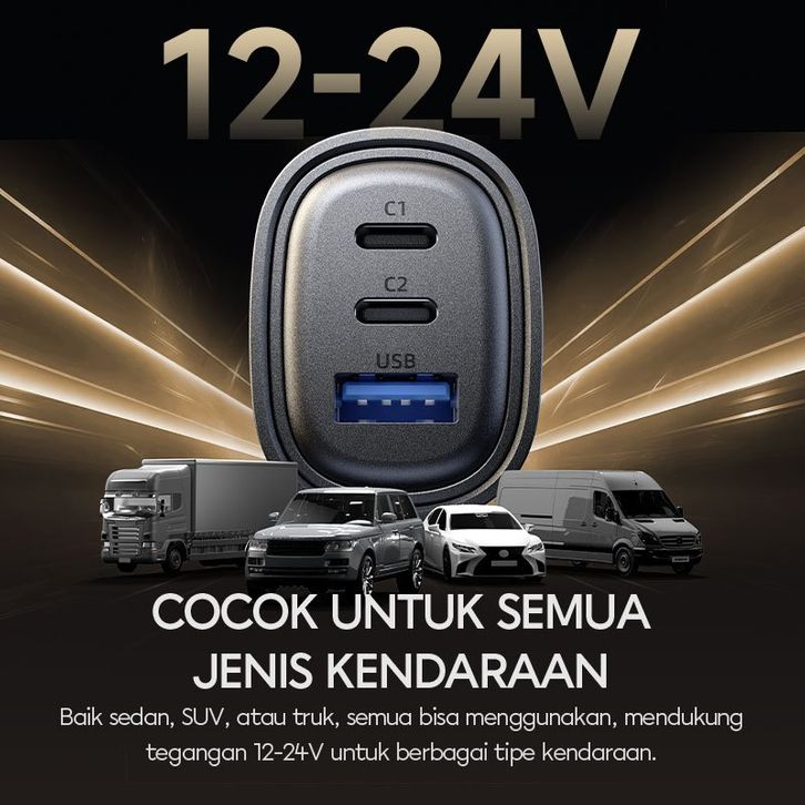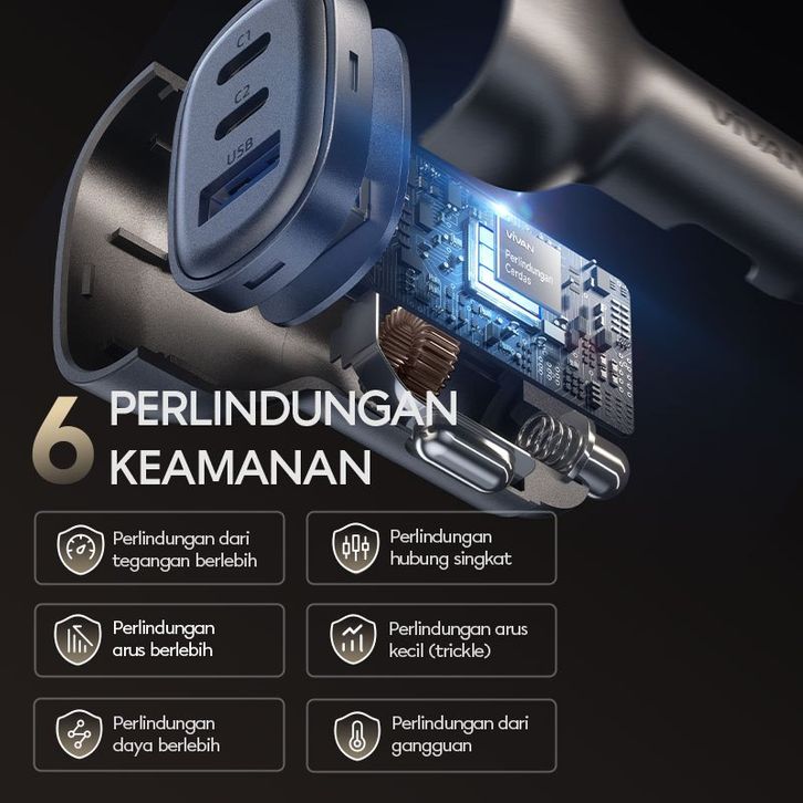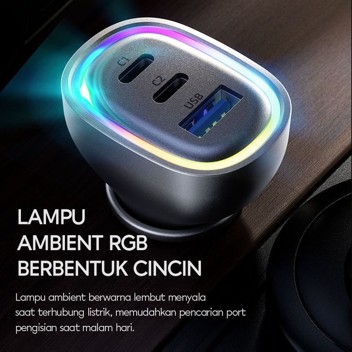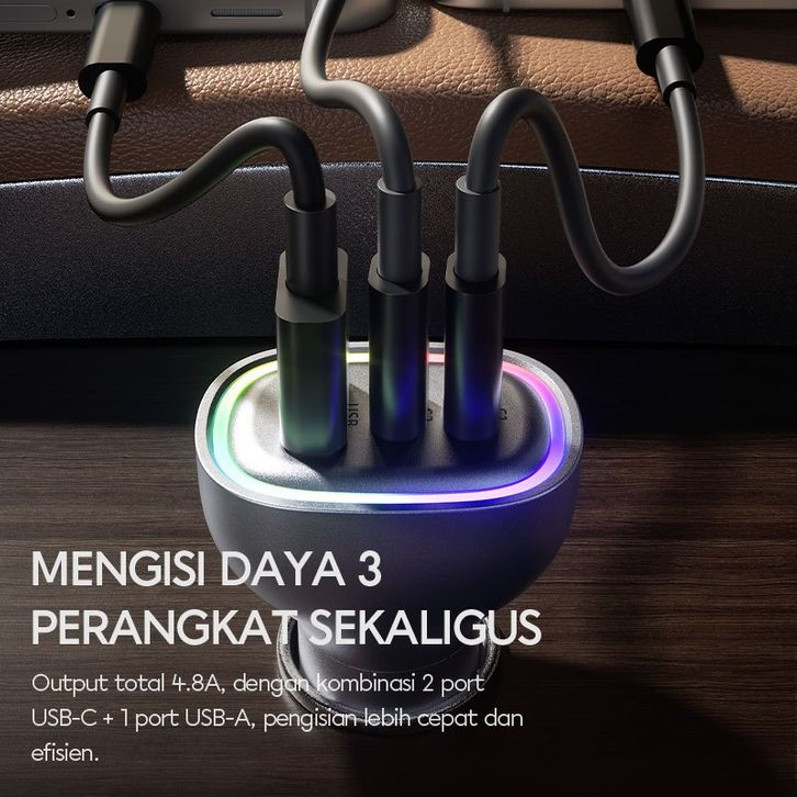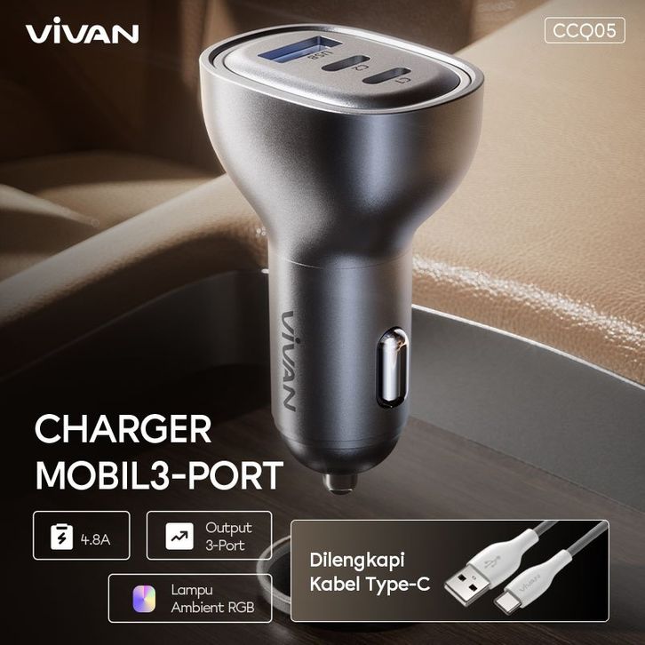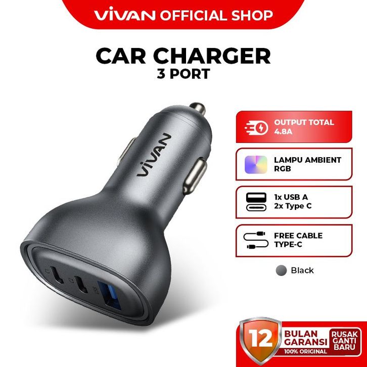 VIVAN Car Charger 3 Port 4.8A Max with RGB Light Free Type C Cable CCQ05 Garansi 12 Bulan