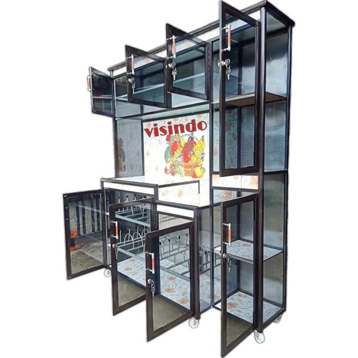 LEMARI DAPUR RAK PIRING ALUMINIUM KACA KERAMIK 8 PINTU JUMBO KAKI RODA COKLAT