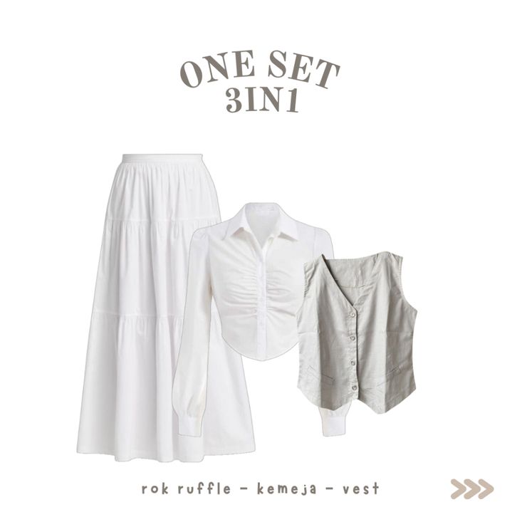 One Set Outfit Korean Style Kemeja, Vest Ivory, Rok Ruffle Setelan OOTD Wanita Terbaru - CTO31