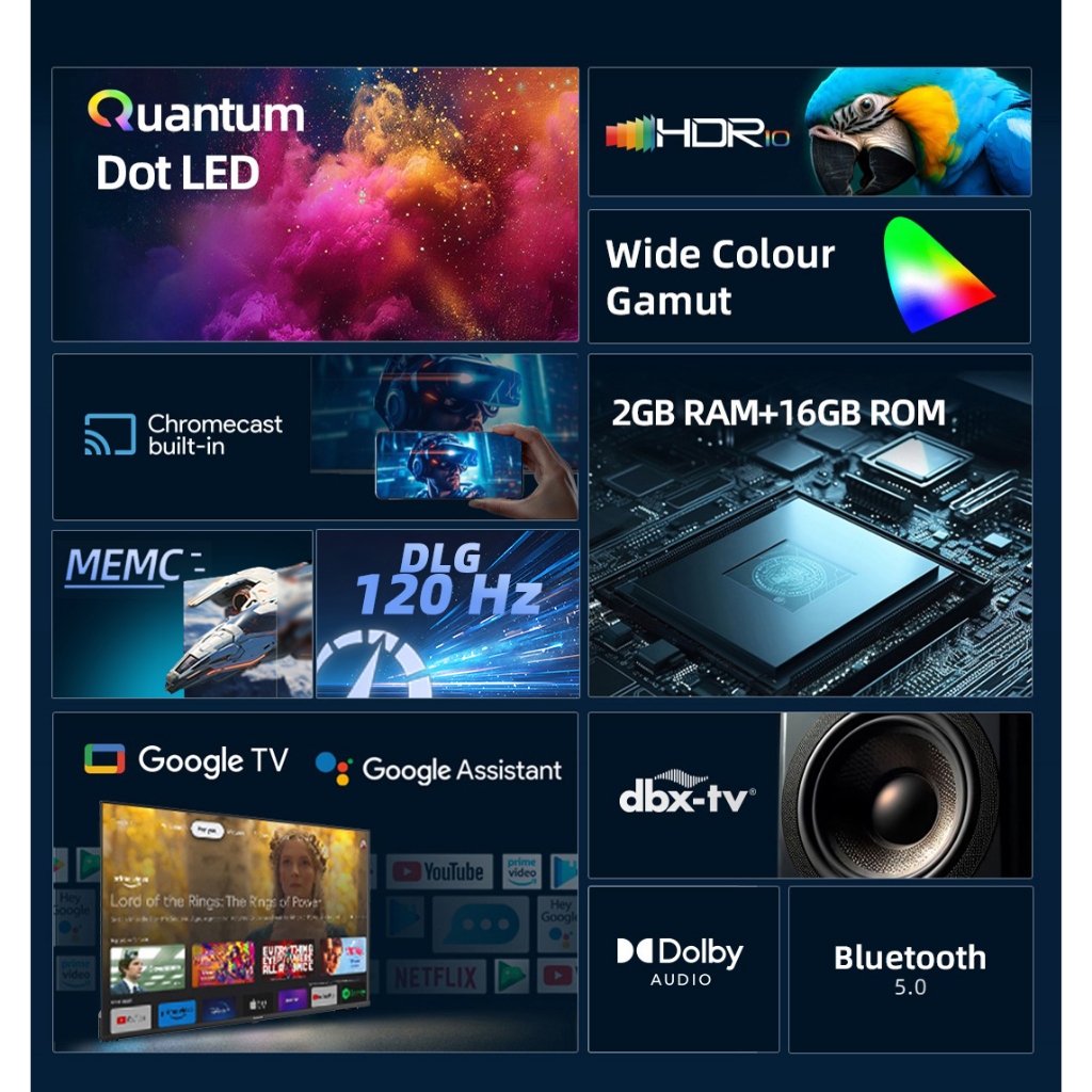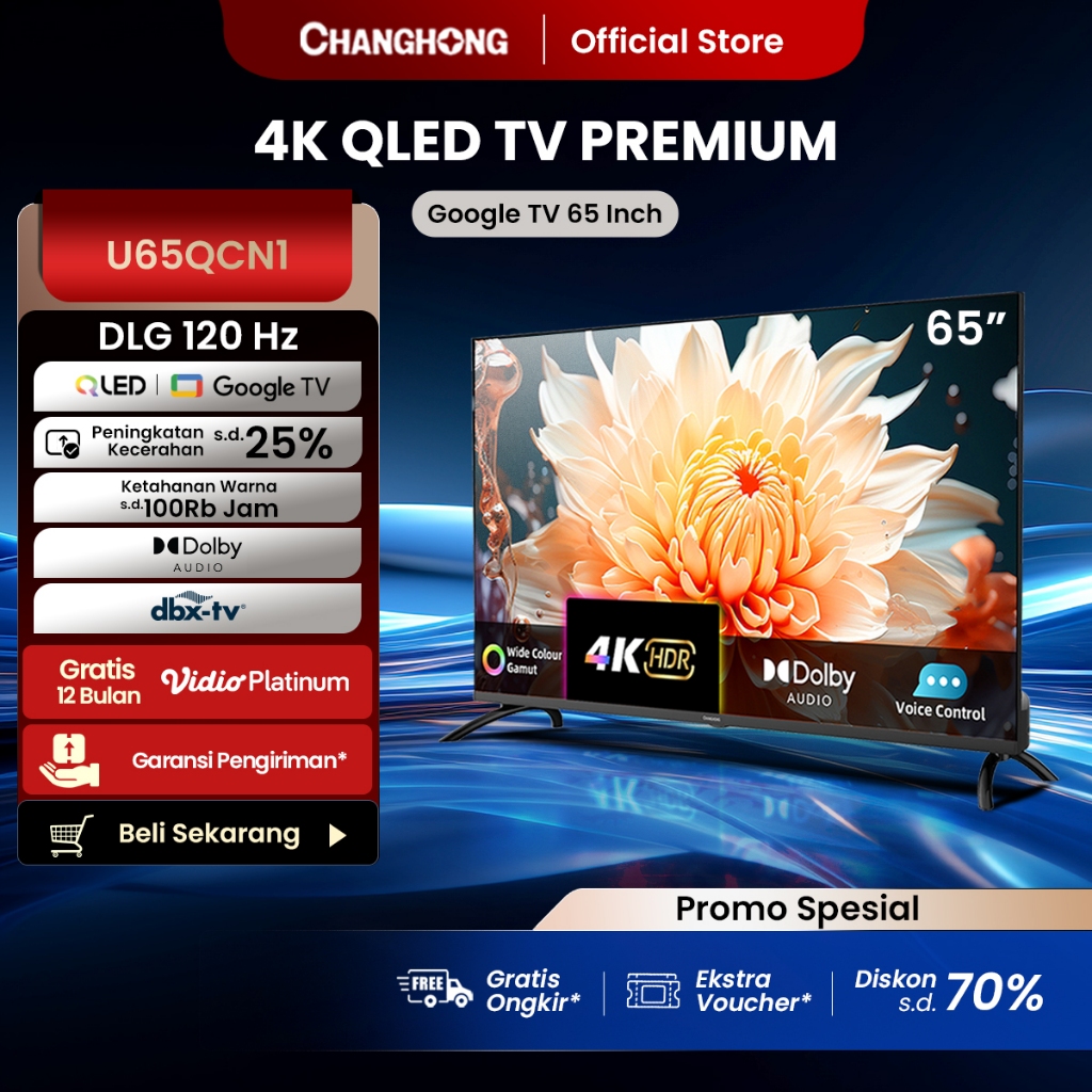 CHANGHONG QLED TV 65 INCH DLG 120HZ 4K GOOGLE TV SMART TV DOLBY AUDIO DBX-TV GOOGLE PLAY NETFLIX YOUTUBE BLUETOOTH GOOGL