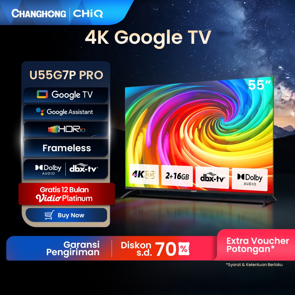 【GOOGLE TV】CHANGHONG CHIQ 55 INCH SMART TV 4K UHD-HDR10+DBX DOLBY AUDIO GOOGLE ASSISTANT NETFLIX YOUTUBE DIGITAL TV (U55
