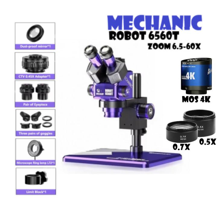 Microscope Trinokular MECHANIC ROBOT 6560T-B11 Zoom 6.5x-60x Plus Lampu Original