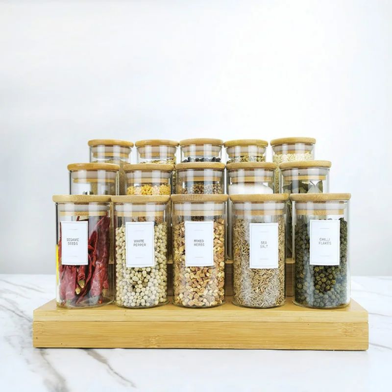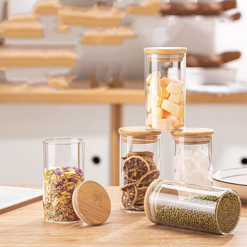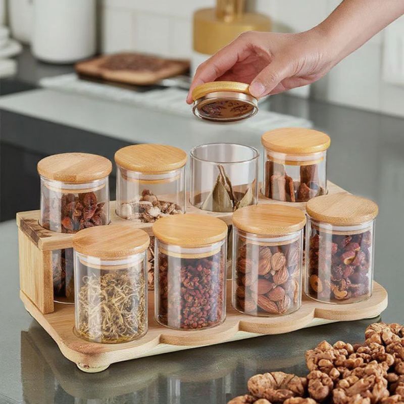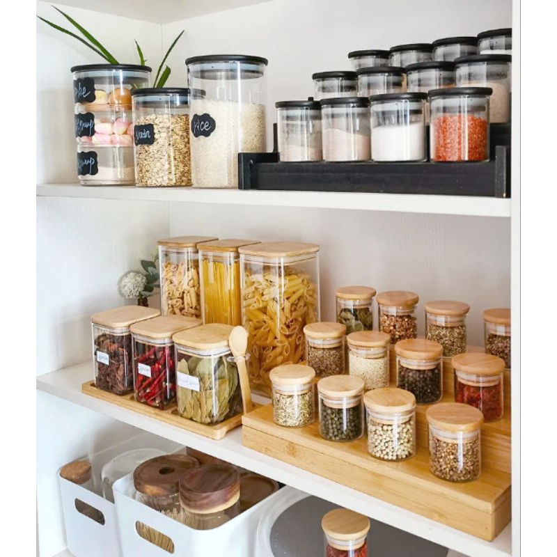 Toples Kaca Bulat Tutup Kayu Kedap Udara / Toples Bumbu Dapur /Toples Penyimpanan Makanan