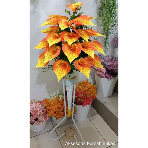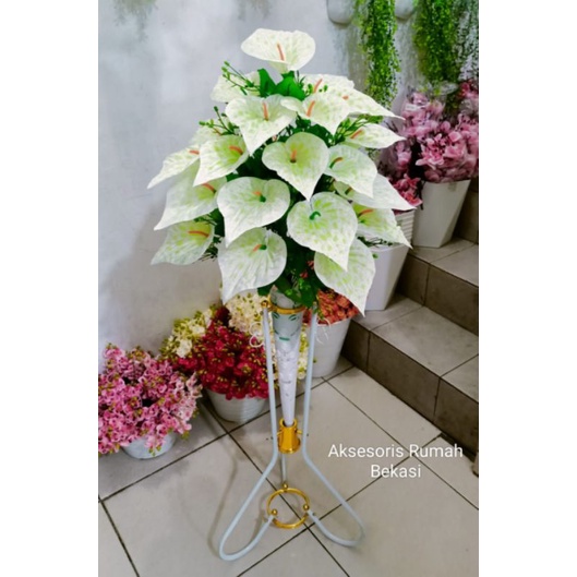 bunga hias sudut ruangan Rangkaian Bunga Anthurium / Bunga Aron Panda Dengan Pot Standing Besi Bunga Sudut Ruangan