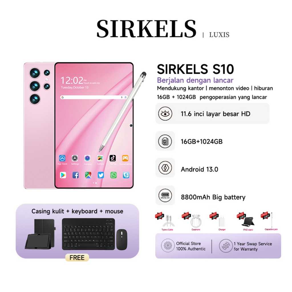 Sirkels Tablet S10 | Ram 16gb + 1024gb Rom | Tablet + Mouse + Keyboard + Case | 5g Dual Sim Wifi | Layar Besar 11.6 Inci