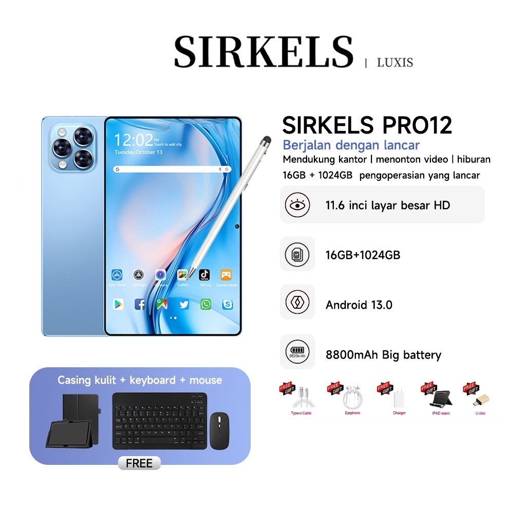 [Mall] SIRKELS Tablet Pro12 11.6 Inch | RAM 16GB + 1024GB ROM | Tablet + Mouse + Keyboard + Case | Layar 8800Mah Full