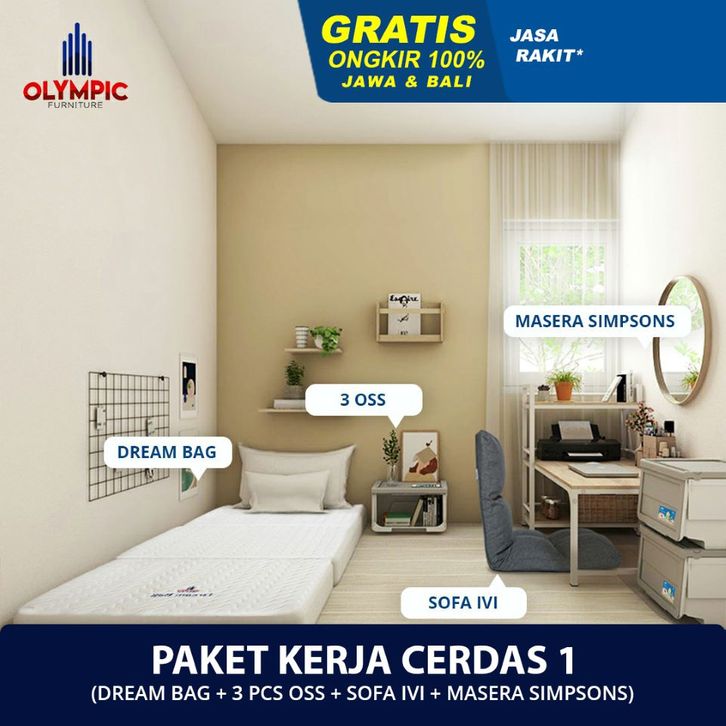Olympic Paket Kerja Cerdas 1 – Meja Belajar 1Pcs + Sofa Lantai 1Pcs + Kasur Busa 1Pc + Box Penyimpanan 3Pc