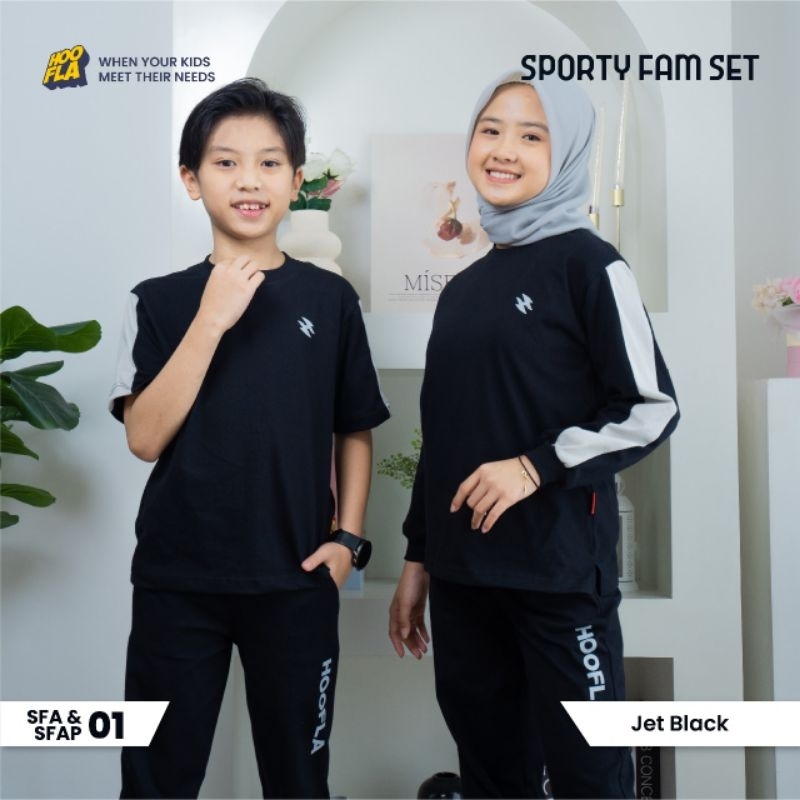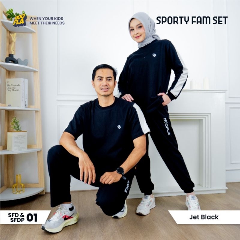 SET BAJU OLAHRAGA ANAK DAN DEWASA SPORTY FAM SET JET BLACK BAJU SARIMBIT OLAH RAGA HOOFLA