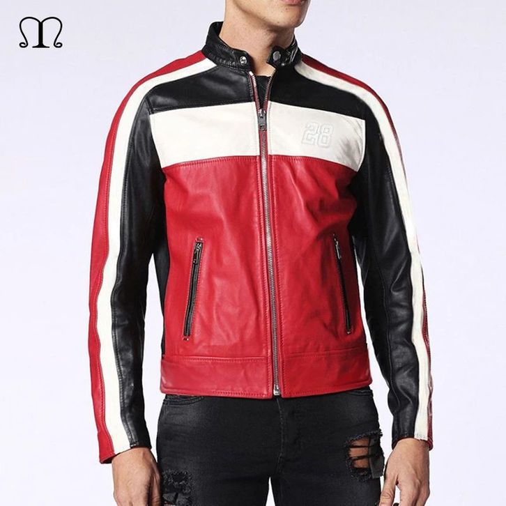 JAKET KULIT MOTOR ASLI DOMBA | JAKET KULIT PRIA WARNA MERAH STRIP HITAM DAN PUTIH MODEL TERBARU KETEBALAN 09mm