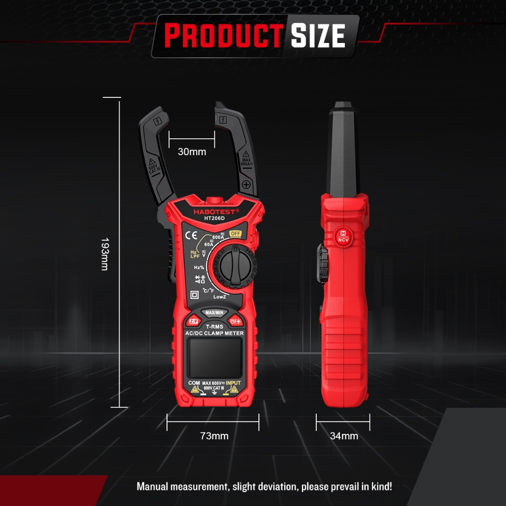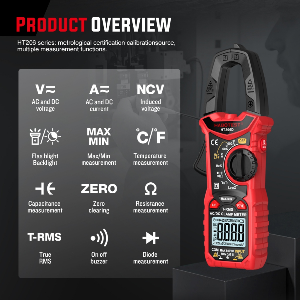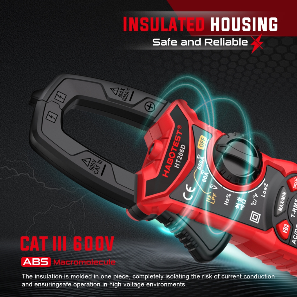 HABOTEST HT206 Meteran Uji Ampere Tegangan Ohm Klem 600V AC/DC 6000 Multimeter Digital Penghitung Rentang Arus Otomatis