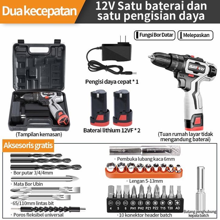 Bor Listrik Bor Tanpa kabel 12V Set Lengkap Mata Bor Cordless Drill Full Set Of Drill Bits【baru】