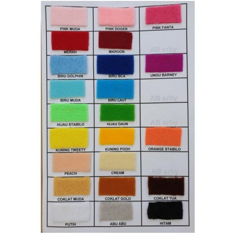 Pink Muda, Merah, Ungu Muda, Ungu Tua, Marun, Hitam, Abu-Abu, Fanta, Dogger, Biru Tua, Biru Muda, Biru Mint, Kuning Pooh, Kuning tweety