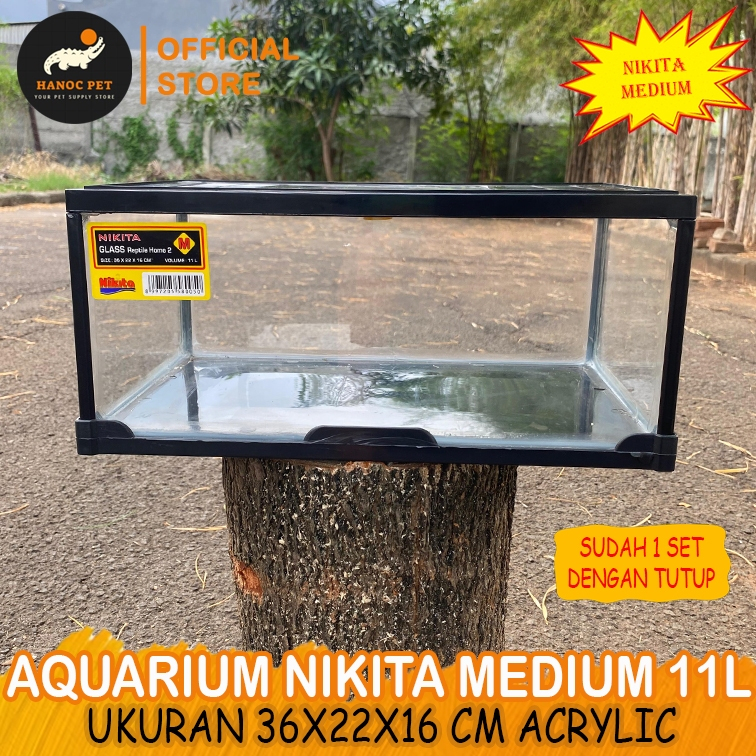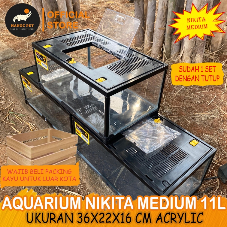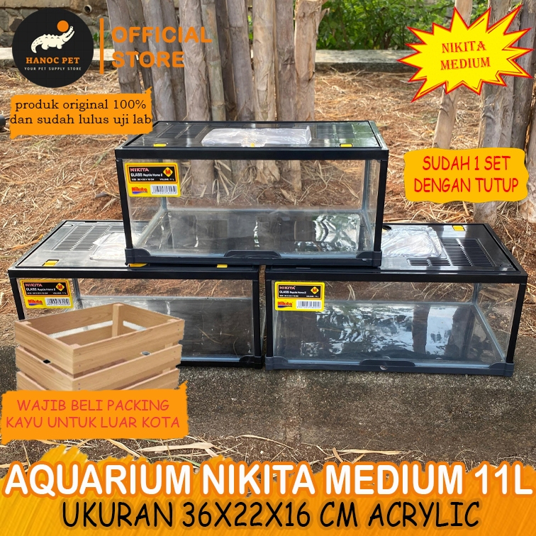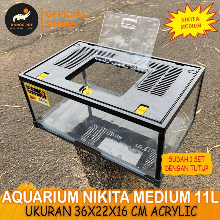 Aquarium Reptil Nikita Size Medium Pendek + Tutup 11Liter Kandang Kura Torto Kadal BP Bahan Acrylic Premium Mirip Gex