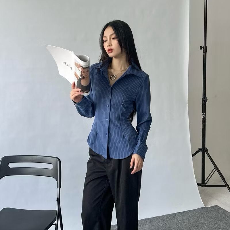 ELTON SHIRT KEMEJA WANITA GARIS GARIS KEKINIAN TERBARU SLIM FIT KEMEJA KERJA HITAM CEWEK KOREAN LENGAN PANJANG