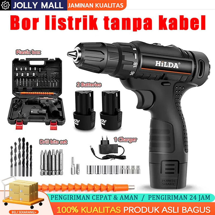 Hilda Bor Baterai Mesin Bor Listrik Tanpa Kabel Inpact Drill Cordless Drill Koper 2 Baterai