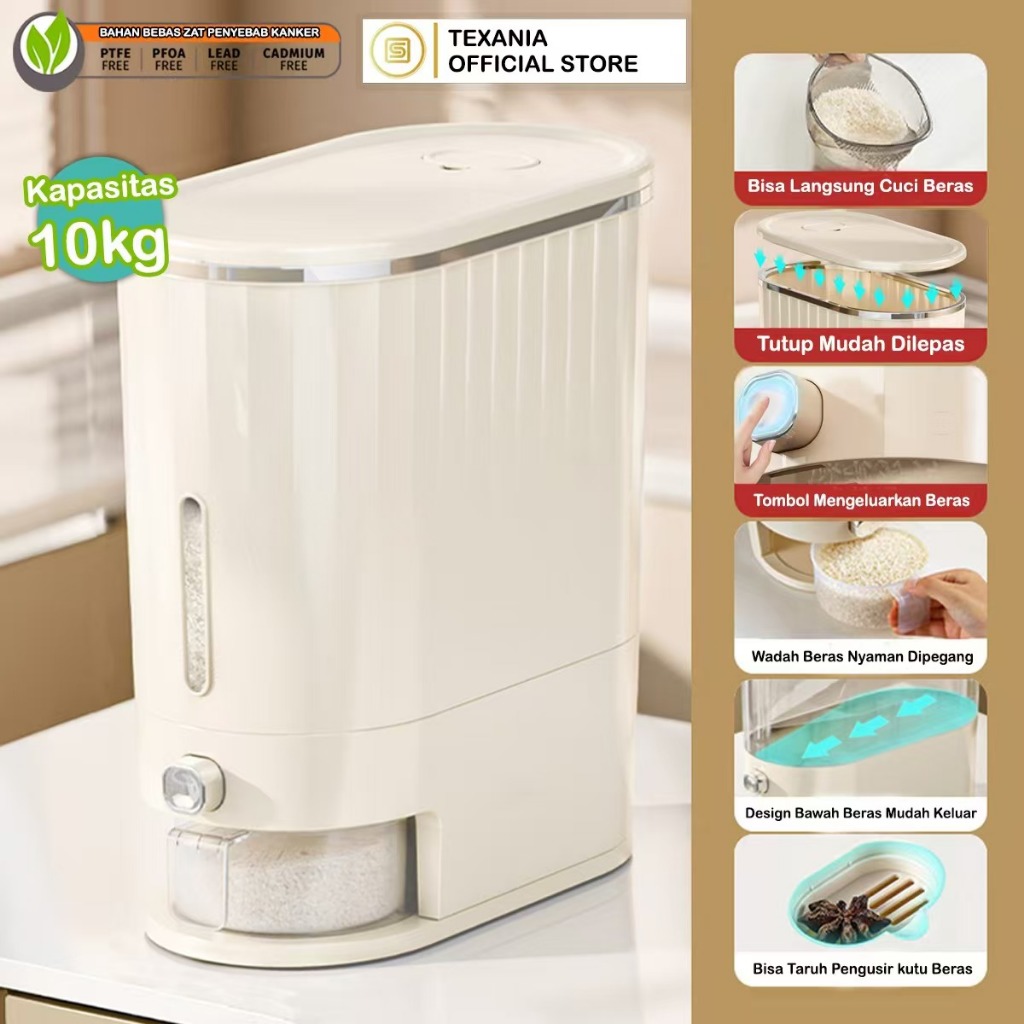 TEXANIA Dispenser Beras Tekan 10KG Food Grade Tahan Lembab Tempat Penyimpanan Beras Food Grade Anti Kutu