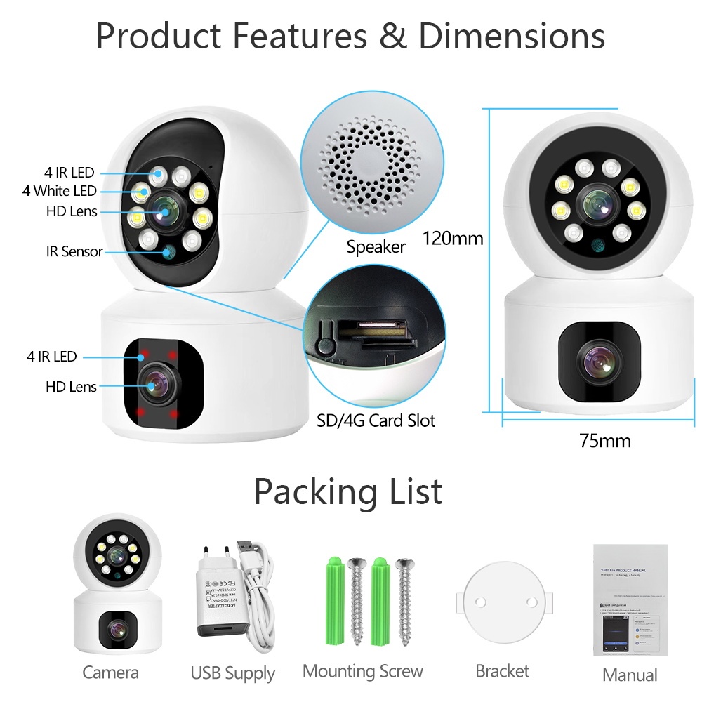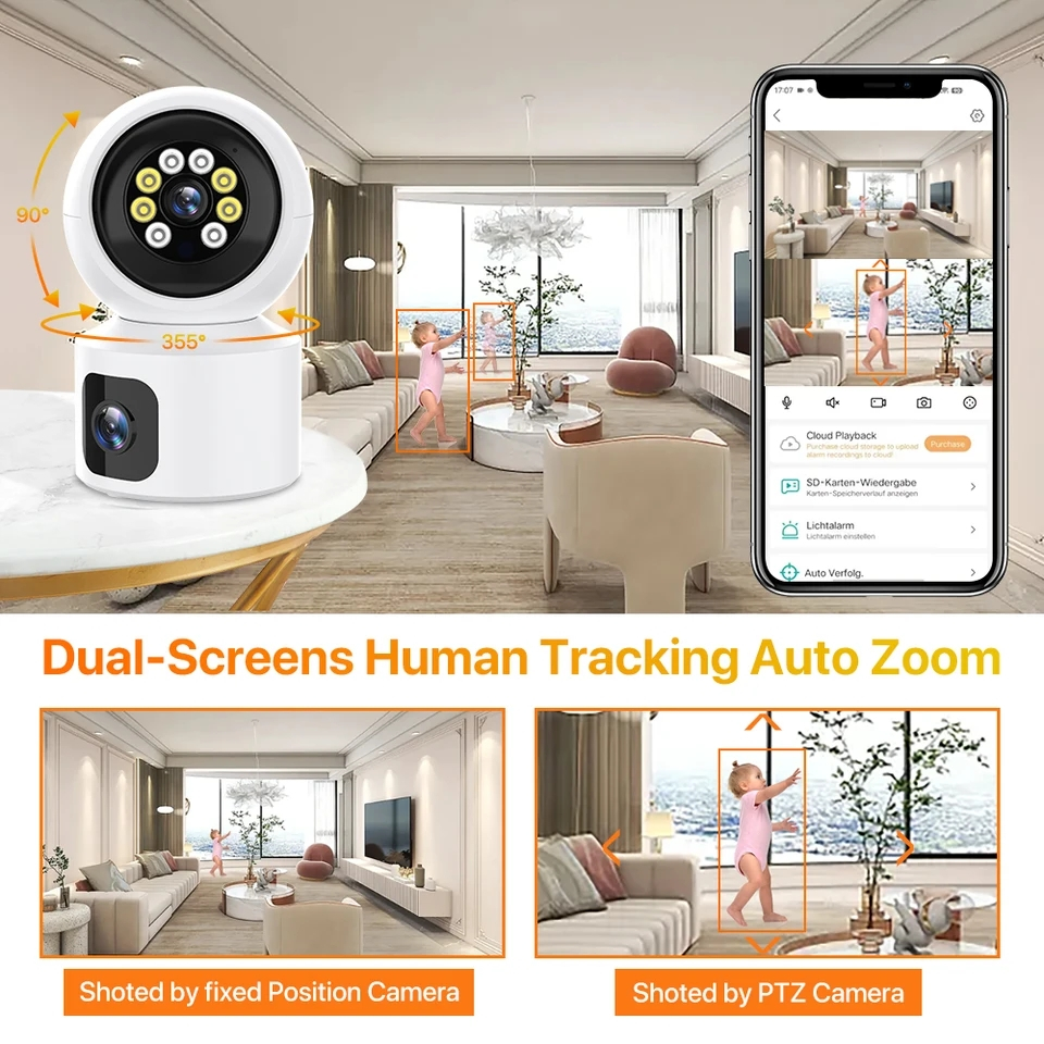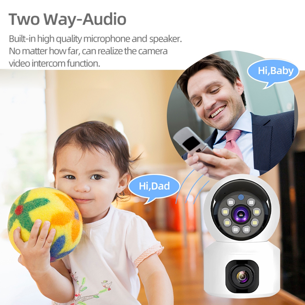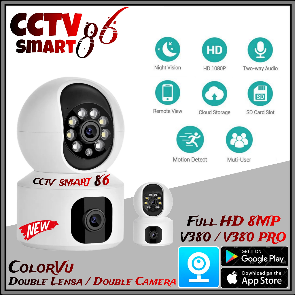 IP Camera CCTV Wifi V380 8MP Double Lensa 360" PTZ Kamera 2 Screen Monitor Auto Tracking