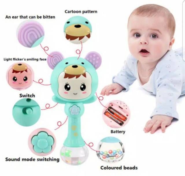 Mainan Bayi Tongkat Rattle + Teether+ Musik + Lampu Kelap Kelip.