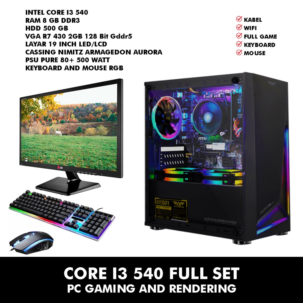 PC GAMING CORE I3 540 RAM 8GB SSD 256 GB LAYAR 19 INCH